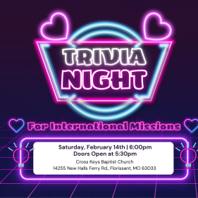 Join us for our Love and Friendship Themed Trivia Night on Saturday, February 14 at 6:00 PM (doors open at 5:30 PM) for an evening of fun, fellowship, and friendly competition—all for a great cause. Enjoy trivia, great company, and a silent auction, with all proceeds supporting international missions in El Salvador and Malawi, helping share Christ’s love around the world.